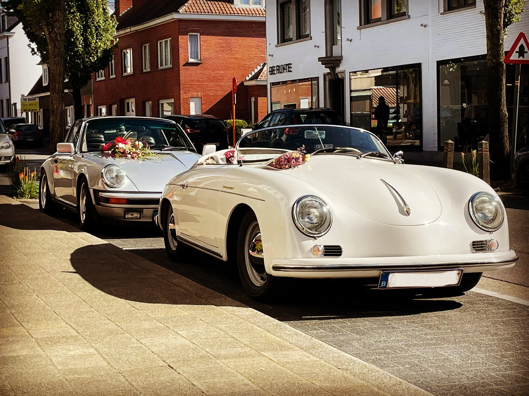 Proficiat met jullie trouwplannen. Dit wordt zonder twijfel één van de mooiste momenten uit jullie leven. Wellicht zijn jullie al volop bezig aan de voorbereidingen. Staat een ceremoniewagen al op jullie checklist? Wij kunnen jullie daarbij alvast (letterlijk en figuurlijk) op weg helpen. Onze unieke oldtimer Porsches kunnen niet ontbreken op jullie bruilloft. De wagens, een 356 Speedster van 1967 en een 911 Targa van 1978 zijn beiden iconen die ook jullie trouwfoto’s naar een hoger niveau zullen tillen. Je kan deze wagens huren voor een halve of volledige dag .
